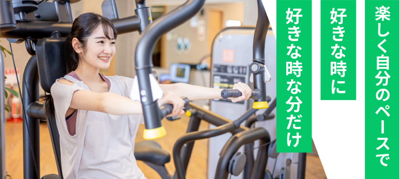 トレーナーが作成した1人ひとりの専用トレーニングメニューを基に、お好きな時間帯にジムでセルフトレーニングもしていただけます。